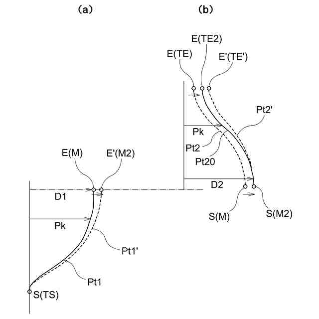 このことを顧みて先行文献2では、搬送効率の低下や搬送軌道の特性を損なうことなく位置ずれを補正する手法を提案している。具体例として、図13(a)に示すオフライン軌道Ptに対して、開始位置Sは同じで、オフライン上で求められた停止位置Eとティーチングで設定された停止位置E’の間に位置ずれが生じた場合を説明する。勿論、図14に示すように、停止位置Eが同じで開始位置Sがずれていても、両方ずれていても同様である。