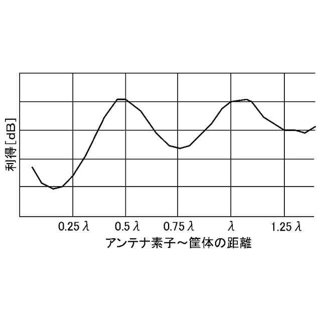 図7は、筐体の厚みがλで一様の場合におけるアンテナ素子と筐体との間の距離とアンテナ利得との関係についてのシミュレーションの結果を示すグラフである。