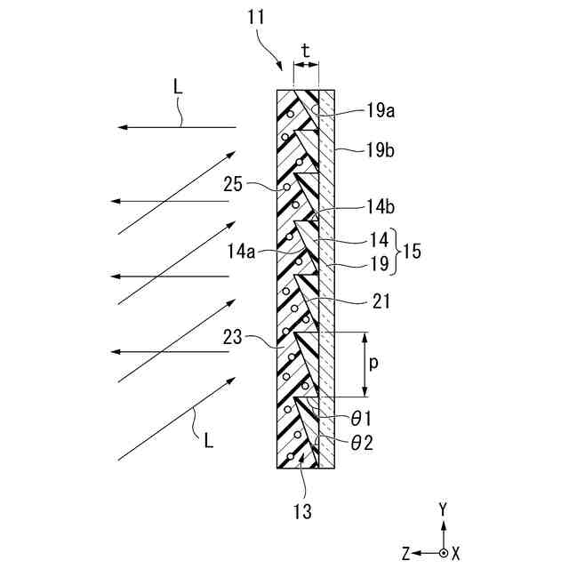図2に示すように、スクリーン11は、X軸方向の長さがY軸方向の長さよりも長い長方形状の形状を有する。スクリーン11は、図2の紙面の手前側に突出する複数の凸部14を備える。複数の凸部14は、半径が互いに異なる円弧状の形状を有する。複数の凸部14は、円弧状の凸部14が同心円状に配列されたフレネルレンズ部13、いわゆるサーキュラー型のフレネルレンズ部を構成する。フレネルレンズ部13は、複数の凸部14のそれぞれが投射装置12から射出される投射光Lを観察者側に向けて反射する。