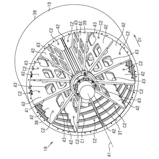 前記リブは、前記回転体の内部空間を複数の分割空間に仕切り、