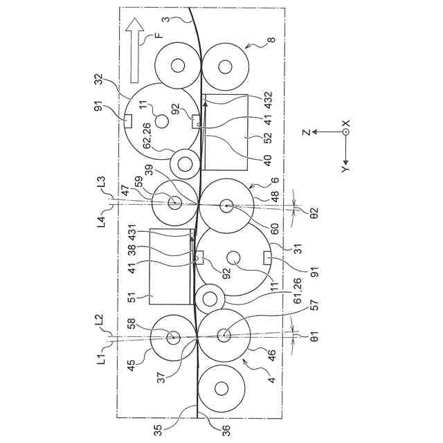 前記第2ニップ位置の接線方向は、前記第2下流側ローラーの回転軸が、前記第1下流側ローラーの回転軸よりも前記第2読取部側にずれて配置されて作られている、