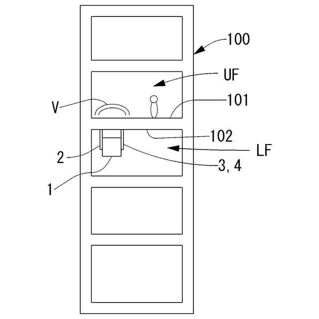 このように、天吊り式空調機1の振動を十分に低減しきれない場合、図3に示すように、スラブ101に振動が伝搬され、当該振動に含まれる振動数成分Vが上階UFの事務所等の机の固有振動数に一致した場合、振動が増幅されることによって、机上で不快な振動が生じる場合がある。