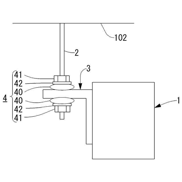 そこで、図3乃至図5に示すように、天吊り式空調機1に起因する振動が建物100のスラブ101へ伝達されることを抑制すべく、建物100のスラブ101の下面である天井102から垂下するように設けられた吊りボルト2に、支持具3及び防振装置4を介して天吊り式空調機1が取付けられている。
