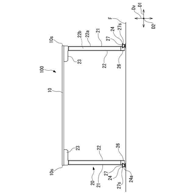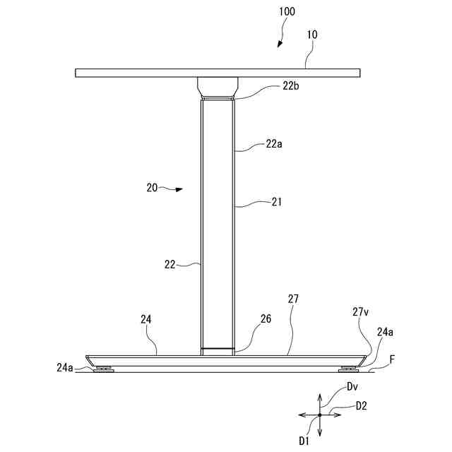 オフィスや公共施設等において、各種作業を行うことのできる作業面を有した天板を備えた天板付什器(例えば、デスクやテーブル等)が用いられている。このような天板付什器において、天板と、天板付什器と隣り合って配置された他の什器や壁等との間に、隙間をあけて配置することがある。このような場合、天板付什器の位置がずれると、天板と、他の什器や壁等との間の隙間が変動してしまう。