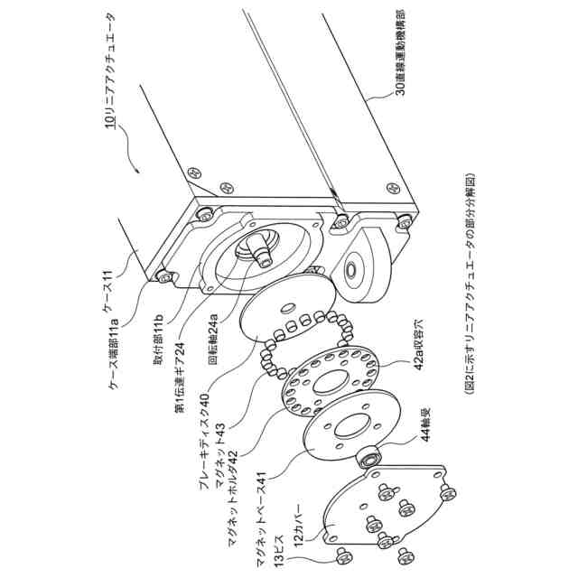 【解決手段】リニアアクチュエータ10は、モータ20の回転軸21に設けられた駆動ギア22と、伝達ギア群23と、直線運動機構部30と、カバー12とを備え、伝達ギア群23は、第1伝達ギア24を有し、第1伝達ギア24に、共に回転可能に接続されたブレーキディスク40と、ブレーキディスク40に対向し、カバー12に固定されて設けられたマグネットホルダ42と、マグネットホルダ42に複数配置されたマグネット43とをさらに備える。