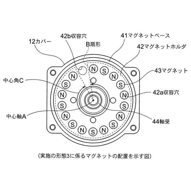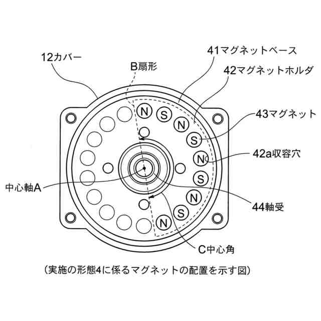 前記マグネットホルダ(42)において、前記中心軸を中心とし、前記第1の円周よりも小さい直径を有する第2の円周上に等角度間隔に複数配置された第2永久磁石(43e)と