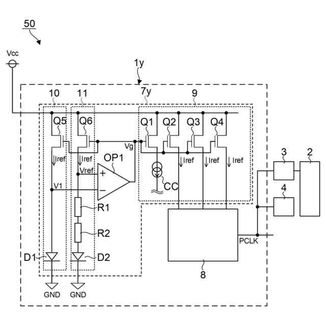 図1は、半導体装置50を示す回路図である。半導体装置50は、オシレータ回路1yと、メモリ回路2と、チャージポンプ回路3と、カウンタ回路4と、を備える。