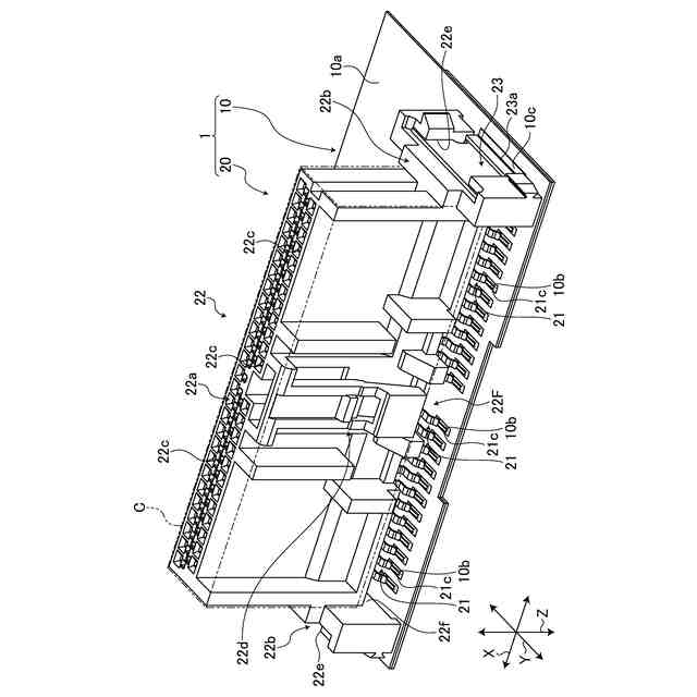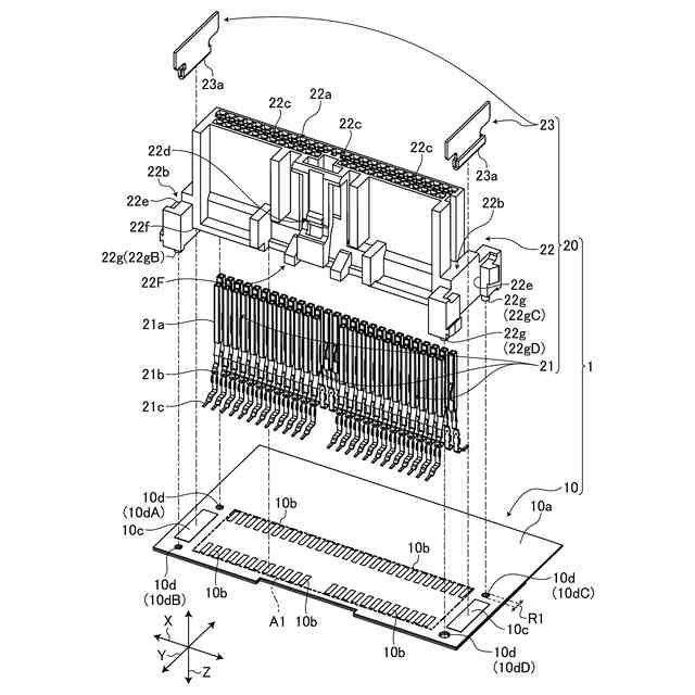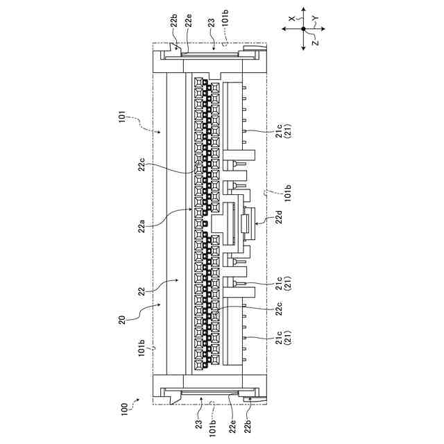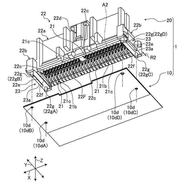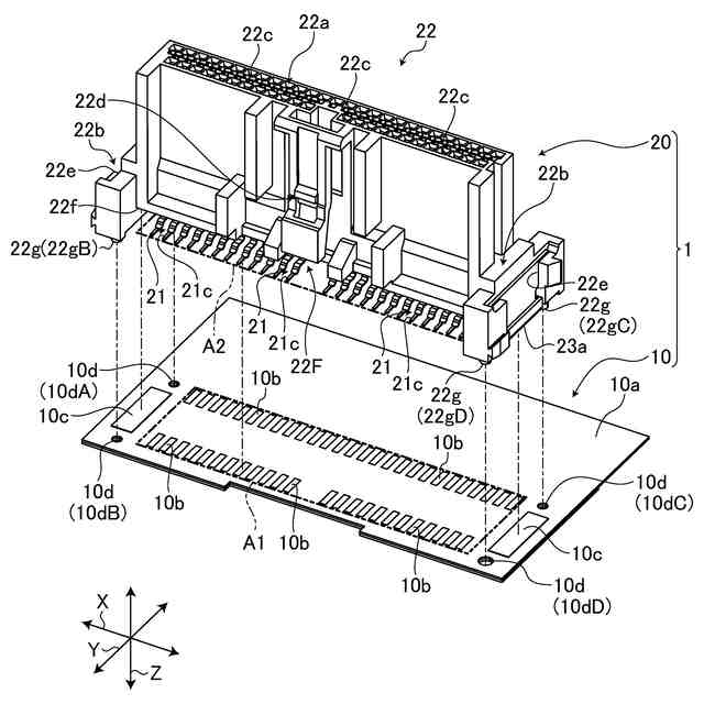 前記ハウジングは、前記基板対向面において前記実装端部の露出領域周りに複数配置され、かつ、前記基板対向面に露出した前記実装端部より突出して形成されるボスを有し、