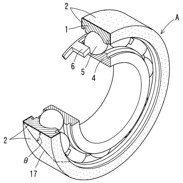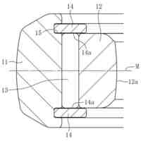 図7に示すように、このような絶縁被膜11を射出成形するには、軌道輪と金型の間の円環状のキャビティーに対し、径方向に対向する位置に配置されるピンゲート12、13から溶融樹脂を射出するので、ウエルドライン14が円環状のキャビティーの周方向に直交する向き(軸方向に一致する向き)に形成される。