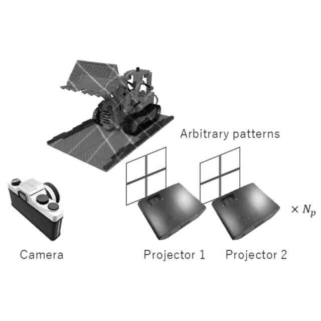 [16] パターンが投影された三次元形状を有する対象を撮像手段で撮像することにより得られた画像を、ニューラルネットワークで処理し、三次元空間に関する情報を得る手段と、