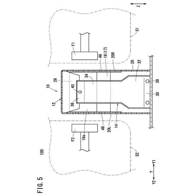 図1に示すように、本実施形態に係るコンソールボックス構造10は、車両100の車室内において、ダッシュボード102の下方且つ後方に配置されている。車両100の動力源は特に限定されず、車両100は内燃機関車又は電気自動車のいずれでもよい。以下の説明において、「前方」は、車両前後方向(X方向)における前方(X1方向)を意味する。「後方」は、車両前後方向における後方(X2方向)を意味する。「上方」は、鉛直方向(Z方向)における上方を意味する。「下方」は、鉛直方向における下方を意味する。車幅方向(Y方向)は、車両100の左右方向である。車幅方向のうち、Y1方向は右方向であり、Y2方向は左方向である。