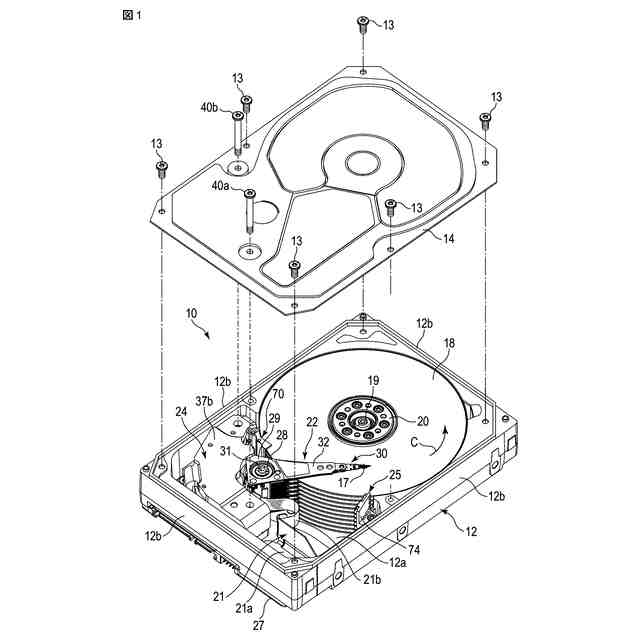 図1に示すように、HDDは、ほぼ矩形状の筐体10を備えている。筐体10は、上面の開口した矩形箱状のベース12と、複数のねじ13によりベース12にねじ止めされベース12の上部開口を閉塞するカバー(トップカバー)14と、を有している。ベース12は、カバー14と隙間を置いて対向する矩形状の底壁12aと、底壁12aの周縁に沿って立設された側壁12bとを有し、例えば、アルミニウム合金により一体に成形されている。側壁12bは、互いに対向する一対の長辺壁と互いに対向する一対の短辺壁とを含んでいる。カバー14は、例えば、ステンレスにより矩形板状に形成されている。カバー14は、その周縁部がねじ13により側壁12bの上面にねじ止めされる。