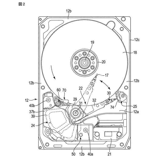 筐体10内には、ディスク状の記録媒体として複数枚、例えば、10枚の磁気ディスク18、および磁気ディスク18を支持および回転させるスピンドルモータ19が設けられている。スピンドルモータ19は、底壁12a上に配設されている。各磁気ディスク18は、例えば、直径96mm(3.5インチ)の円板状に形成され、非磁性体、例えば、ガラスあるいはアルミニウムからなる基板と、基板の上面(第1面)および下面(第2面)に形成された磁気記録層とを有している。一例では、アルミニウムの基板を用いている。各磁気ディスク18は、スピンドルモータ19のハブに互いに同軸的に嵌合されて、更に、クランプばね20によりクランプされている。これにより、磁気ディスク18は、ベース12の底壁12aと平行に位置した状態に支持されている。複数枚の磁気ディスク18は、スピンドルモータ19により所定の回転数で回転される。なお、磁気ディスク18の搭載枚数は、10枚に限らず、9枚以下、あるいは、11枚以上としてもよい。