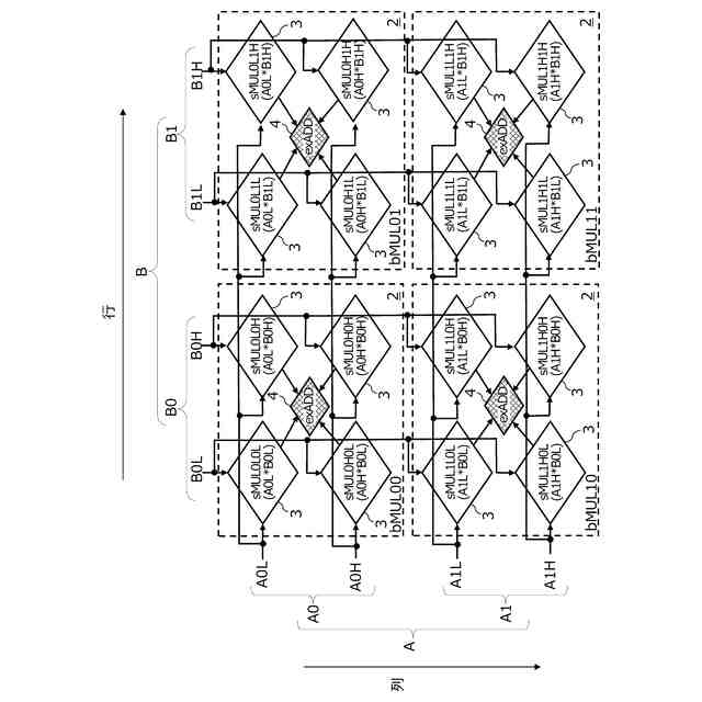【解決手段】複数の第1演算器3と複数の第1演算器3のそれぞれに接続される補助演算器4とを有する第2演算器2が格子状に複数、配置され、複数の第2演算器2のそれぞれにおいて、複数の第1演算器3のそれぞれは、行列積の乗数を分割して生成される部分行列と、被乗数を分割して生成される部分行列との乗算を行なって部分行列積を算出し、補助演算器4は、複数の第1演算器3のそれぞれによって算出された部分行列積の桁合わせと加算を行なう。