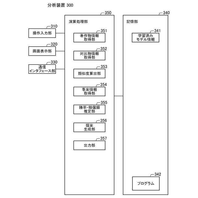 【解決手段】分析装置は、著作物と対比物とに応じて算出される類似度と、著作権侵害事件の内容に応じた情報である事案情報と、の入力に応じて、裁判を行った際の勝率と賠償額を推定する推定部と、推定部による推定結果に応じて裁判を行った際の費用対効果を確認して、確認の結果に応じた提案を生成する生成部と、生成部が生成した提案を出力する出力部と、を有する。