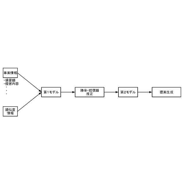 著作物と対比物とに応じて算出される類似度と、著作権侵害事件の内容に応じた情報である事案情報と、の入力に応じて、裁判を行った際の勝率と賠償額を推定し、