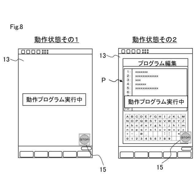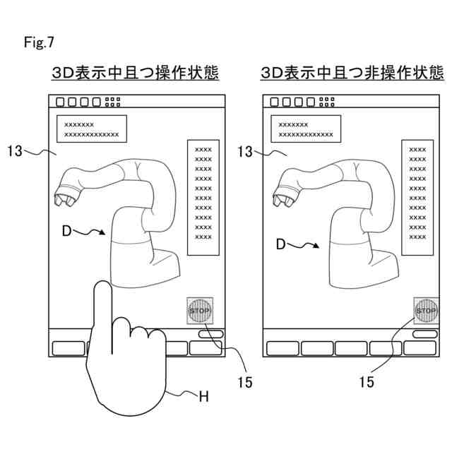 しかしながら、従来のスイッチはいわゆる非常時を想定して設けられたものであり、操作装置を操作している通常時にロボットを即座に停止させるためのスイッチは設けられていなかった。そのため、従来では、通常時にロボットを停止させるためには実行中のプログラムを停止する操作を行う必要があり、ロボットを即座に停止させることができなかった。その一方で、新たなスイッチを単純に表示部に表示させると、情報を表示可能な領域が制限されたり誤操作が増えたりするなど、操作性が悪化するおそれがある。