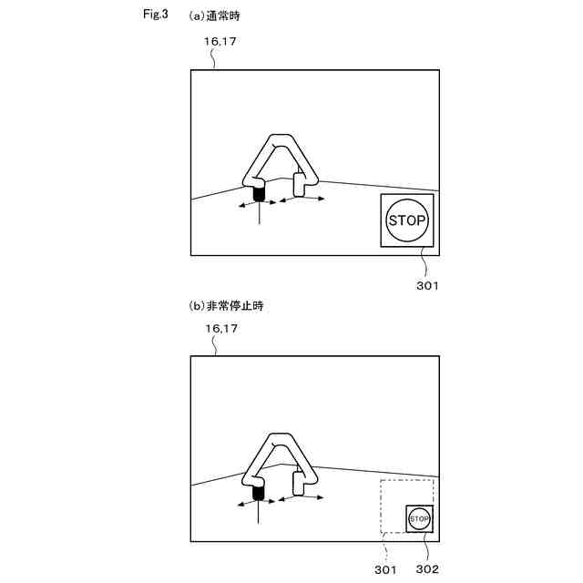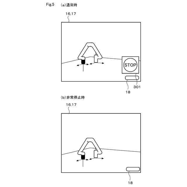 第1実施形態によるロボットの操作装置の一例について、表示部に表示される画面の例であって、(a)ロボットが自動運転実行時の表示例であり、(b)はロボットが手動運転実行時の表示例である