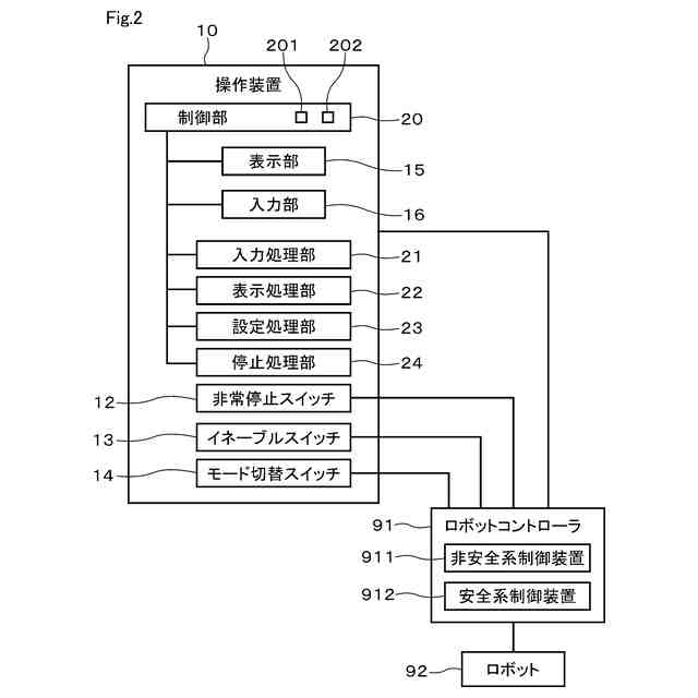 ロボットの教示等を行う操作装置には、作業者等の安全を確保するために、ロボットの非常停止を行う非常停止スイッチや、作業者が意図して操作している間にのみロボットの動作を許可するイネーブルスイッチが設けられている。