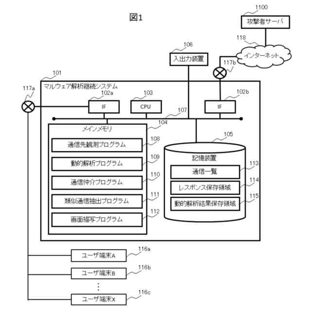 【解決手段】マルウェア解析継続システムは、攻撃者サーバとの通信を観測して、過去データとして前記通信の応答を蓄積する通信先観測プログラムと、マルウェアの動的解析を実施する動的解析プログラムと、動的解析された前記マルウェアの通信を仲介し、前記攻撃者サーバとの通信が停止した場合でも、前記過去データとして蓄積された前記応答を返却することにより前記動的解析を継続するように制御する通信仲介プログラムと、前記マルウェアが発した通信と類似する過去の通信を類似通信として前記過去データから抽出する類似通信抽出プログラムと、前記マルウェアに関する情報を画面に描写する画面描写プログラムと、を実行する。