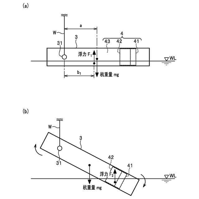 既成杭を水上に浮かべた状態で、杭を建て起こせば、杭に作用する浮力により杭の見かけの重量が軽減する。例えば、特許文献1では、水上に横たわる既成杭の一端部をクレーンで吊り上げることで、杭を建て起こす方法が開示されている。既成杭の下端には、杭の内径よりも小径の流入口が形成されており、この流入口から水を杭の内部に流入させることで、クレーンに伝わる荷重を制御し、杭の建て起こし作業を効率的に行うものとしている。