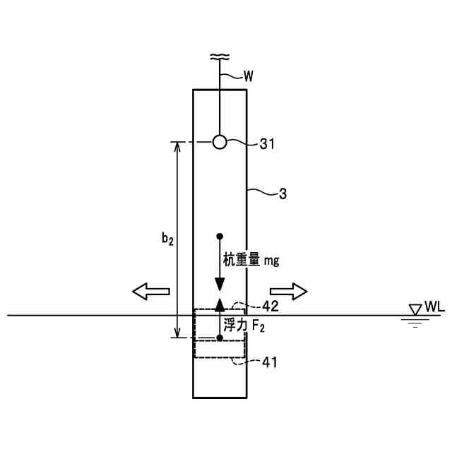 既成杭の施工方法として、クレーン船のクレーンを利用して既成杭を吊り下げるとともに、クレーン船に設けられたパイルグリッパーに既成杭をセットし、パイルグリッパーにより杭の傾き等を制御した状態で施工を行う場合がある。そのため、既成杭に対して十分な揚重能力を有しているクレーン船を使用する必要がある。一方、風力発電機の規格が大きくなるにつれて、モノパイル式基礎に使用する既成杭の重量も増加しており、既成杭を揚重可能なクレーン船を確保できないおそれがある。