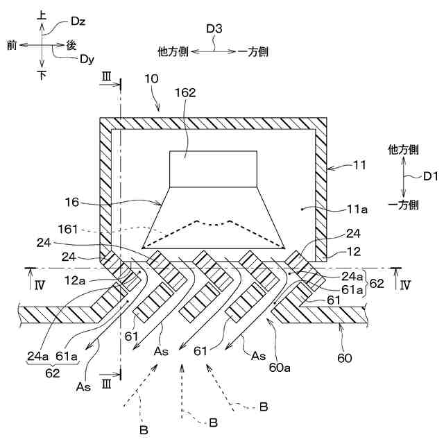 前記筐体開口に設けられ且つ前記筐体に対し固定され、前記第1方向に垂直な第2方向(D2)へ延伸し前記第1方向と前記第2方向とに垂直な第3方向(D3)へ相互隙間(24a)をあけて並び、前記第1方向の前記一方側ほど前記第3方向の一方側に位置するように前記第1方向に対し傾斜した板形状を成す複数の筐体フィン(24)とを備え、