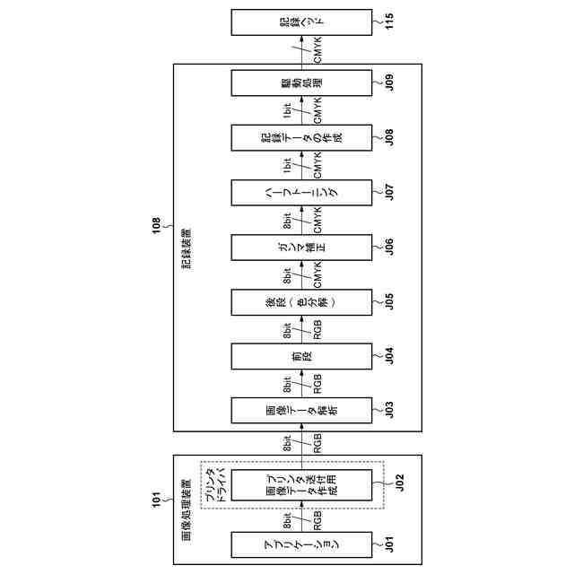 図1は、本実施形態の記録システムの制御系の全体構成を説明するブロック図である。図1に示すように、記録システムは、画像処理装置101と、記録装置108と、後処理工程機構116とを備える。画像処理装置101および記録装置108は、ネットワーク118によって、互いに情報を送受信可能に接続されている。