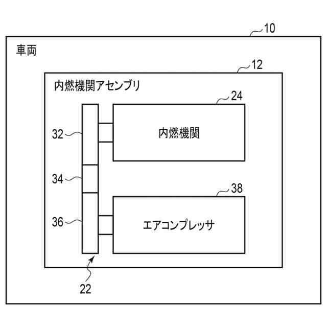 以下、図面を参照しながら、本実施形態に係る車両10の内燃機関アセンブリ12の負荷装置アセンブリ22について説明する。なお、各図における各部材の相対的な大きさは、概略的なものであり、実際のものとは異なることがある。