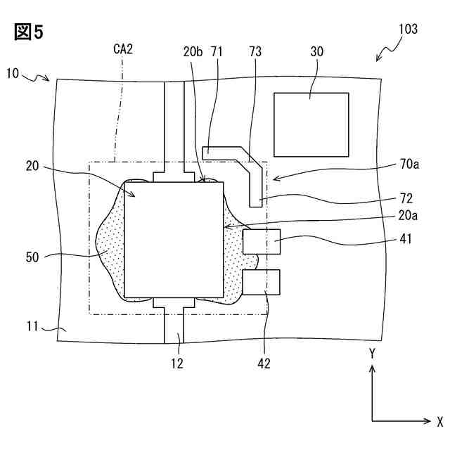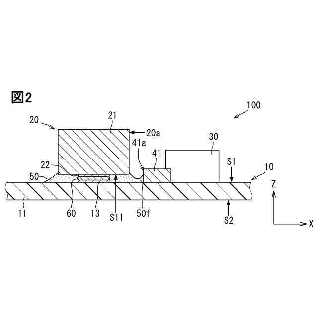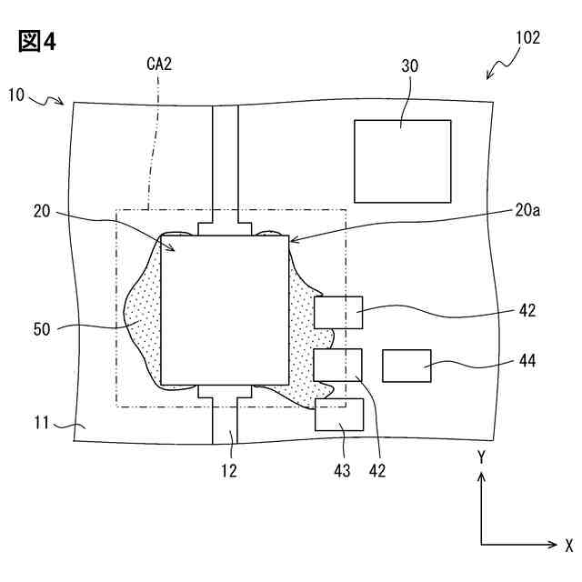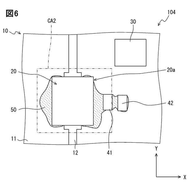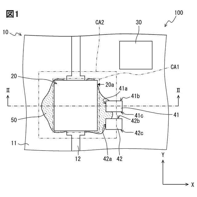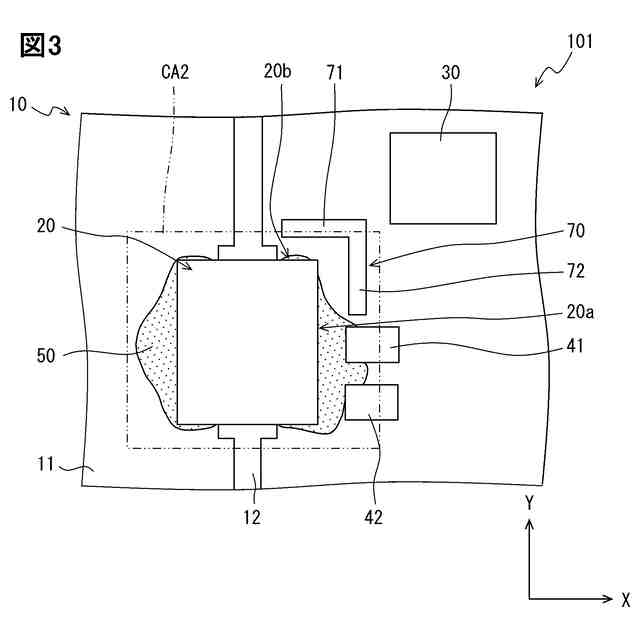 特許文献1には、電子装置が開示されている。電子装置は、基板上に形成されたアンダーフィルの流入から保護すべき保護対象部と、保護対象部品の全体または一部分を囲むように基板に形成されたアンダーフィル流入防止部とを備えている。電子装置は、アンダーフィル流入防止部として、基板に凹状の溝や凸状の壁が設けられている。