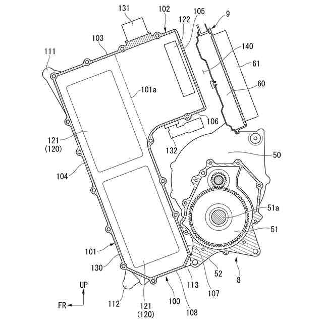(5)上記(1)から(4)の何れか一つに記載の車両構造では、前記長形状部(101)及び前記突出部(102)の各々は、前記車両側面視で矩形状であり、前記蓄電池(100)は、前記車両側面視でL字状であってもよい。