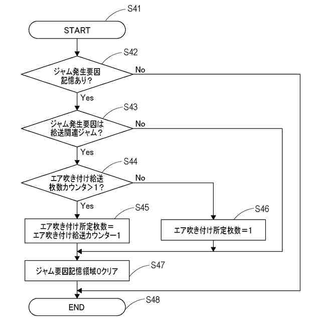 本発明の実施形態に係るRAMに記憶されるエア吹き付け給送枚数カウンタ、エア吹き付け所定枚数、ジャム発生要因記憶領域の初期化制御を示すフローチャート。