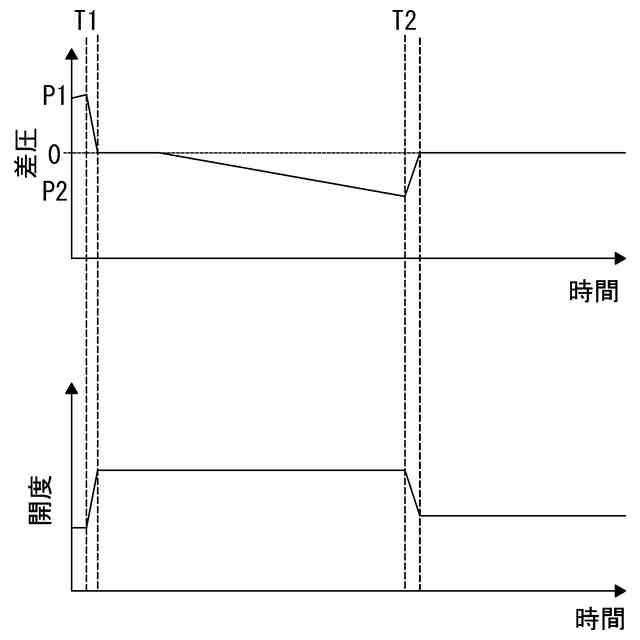 本開示の第一実施形態に係る水電解システムで、水電解セルの差圧調整を行った場合の、水電解セルの差圧の変化と、陰極側ガス流量調整弁の開度との関係の一例を示す図である。