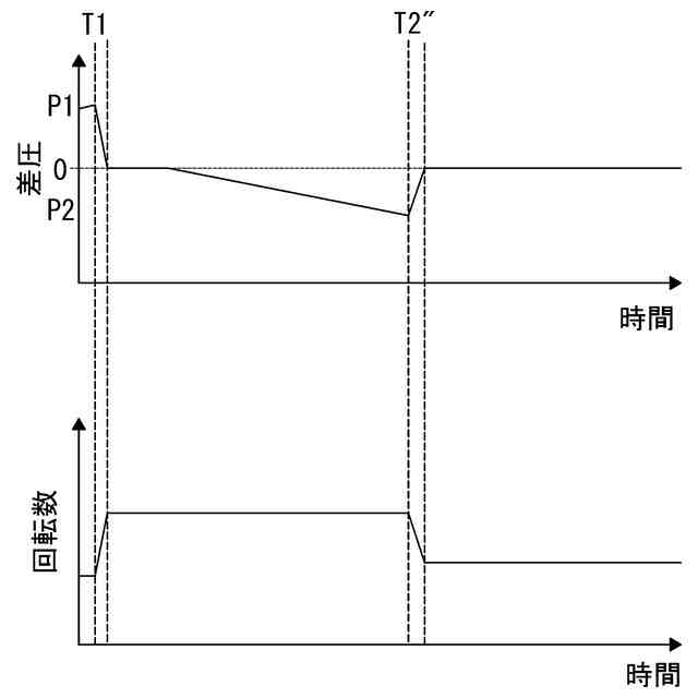 本開示の第三実施形態に係る水電解システムで、水電解セルの差圧調整を行った場合の、水電解セルの差圧の変化と、陰極側ポンプの回転数との関係の一例を示す図である。