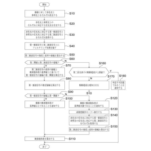 取得される前記第一脈波信号の振幅が算出される前記第一閾値以下である場合、前記動脈の酸素飽和度が前記基準値以上である、と判定すると共に、取得される前記第一脈波信号の振幅が算出される前記第一閾値超である場合、前記動脈の酸素飽和度が前記基準値未満である、と判定する、