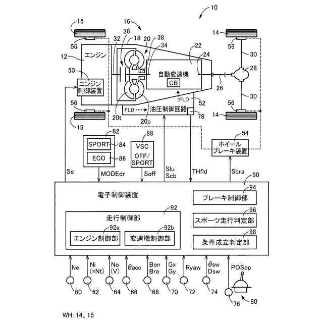 図1は、本発明が適用される車両10の概略構成を説明する図であると共に、車両10における各種制御の為の制御機能及び制御系統の要部を説明する図である。図1において、車両10は、動力源としてのエンジン12と、駆動輪14と、エンジン12と駆動輪14との間の動力伝達経路に設けられた動力伝達装置16と、を備えている。