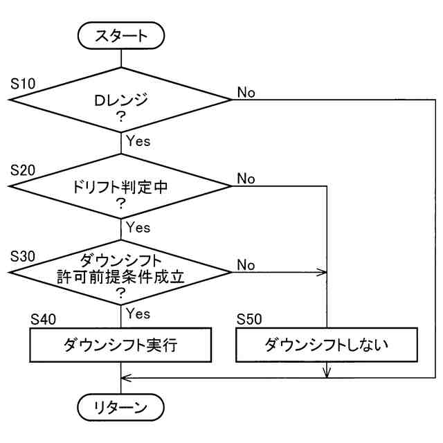 電子制御装置の制御作動の要部を説明するフローチャートであり、ドリフト走行を実行する際に不要なダウンシフトを抑制しつつ駆動トルクを確保し易くする為の制御作動を説明するフローチャートである。