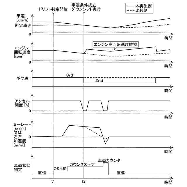 ここで、特許文献1に記載の技術を参照すると、コーナに入る前の強いブレーキ中にダウンシフトを実行することで、低車速側のギヤ段を形成することが可能である。一方で、旋回時に車両を横滑り状態で走行させるスポーツ走行の実行中に、車速やエンジン回転速度が低域まで下がってしまう場合がある。この場合、スポーツ走行の実行中の走行状態によっては、ダウンシフトが判断される領域に入らず、ダウンシフトが行われない可能性がある。そうすると、駆動トルクの不足などによって駆動輪がグリップしてしまい、スポーツ走行の実行中に車両姿勢例えば横滑り状態を上手く保つことができないおそれがある。又は、旋回後は、駆動トルクの不足状態からの加速となる為、再加速が鈍るおそれがある。