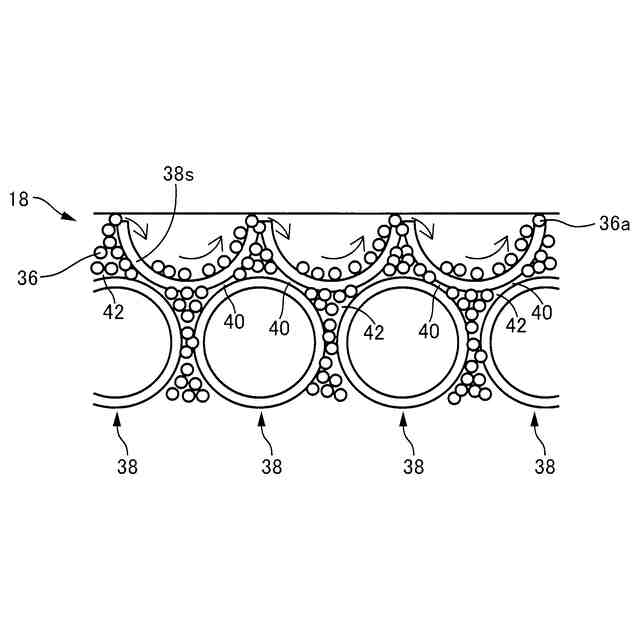 特許文献2に記載された砥粒内包型研磨パッドでは、連通気孔を有する多孔質の母材樹脂と、母材樹脂内に形成された長手状の連通気孔に内包された多数の研磨砥粒と、母材樹脂により連通気孔間に形成され、連通気孔よりも断面積が大きい大径気孔とが備えられている。研磨加工に際して、圧力が加えられると、マイクロポンピング作用(加圧により研磨パッドが押しつけられて連通気孔内の研磨砥粒が大径気孔に向かって押し出される作用)により、連通気孔に内包された研磨砥粒が、連通気孔に連通する大径気孔内に移動して表層の大径気孔内に研磨砥粒が多数滞留し、ワークの下面に接触する作用砥粒が増加するため、研磨能率が高められる。このような作用は、セリア粒子等のいびつ(非球形)な形状で動きが困難である研磨砥粒の場合に顕著である。