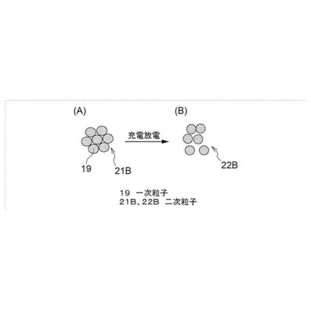 ここで、まず比d/Dが0.010≧d/Dの範囲となる一次粒子のみを有する正極活物質、つまり所定の窪みを有する粒子Eを含まず、円形度の高い一次粒子のみを有する従来の正極活物質について説明する。図4(A)に示すように、円形度の高い一次粒子19同士が凝集して形成された二次粒子21Bでは、一次粒子19同士の接触が点接触となる箇所が多くなり、接触する面積が小さくなる。この正極活物質の二次粒子21Bに対して充電及び放電を施すと一次粒子19に膨張及び収縮が生じ、図4(B)に示すように収縮時に一次粒子19が孤立し、凝集した二次粒子21Bの状態を保てない粒子が存在した状態となることがある。その結果、正極活物質を含む電池において容量の低下が発生することがあった。
