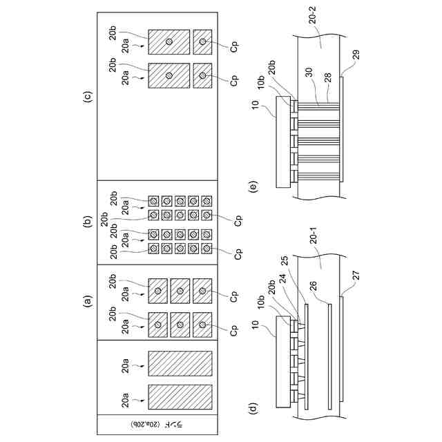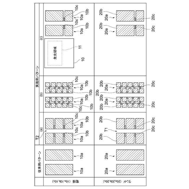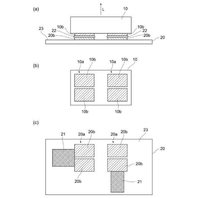 図8(b)は素子搭載基板20の断面図を示している。素子搭載基板20の表面23上に発光素子10が搭載されている。発光素子10は、例えばアノード、およびカソードに対応する2つの電極(図示省略)を有する。一方素子搭載基板20の表面23上には配線パターン(図示省略)が形成されており、当該配線パターンの一部が発光素子10の電極に対応するランドとなっている。一般に素子搭載基板20のランドは発光素子10の電極と同様の形状とされ、ランドと電極との間に半田(図示省略)等を介在させることによって、発光素子10が素子搭載基板20上に固定される。図8(c)に素子搭載基板20のランドのパターンPの一例を示す。発光素子10の電極のパターンもパターンPと同様のパターンとされている。