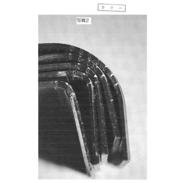 しかしながら、爪エッジ211が直接当たる刃側壁31は忠実に円弧形成が可能であるが、刃先32は爪エッジ211が当たらないので、刃3の胴体に追従して円弧が形成するが、刃先32部分の円弧は外方に開く傾向がある。その結果、円弧刃先32は、他の曲げない直線部分より全高が低くなる。はなはだしい場合は0.1ミリ低くなる。その結果、シートが正確に打ち抜けなくなる。それを救済するために打抜オペレータは「ムラトリ」という作業をする。試抜きで打ち抜けていない部分の刃高を上げるために、ムラトリシート(抜型の裏に挿入されているシート)の低い部分にムラトリテープを貼る。セロテープ1枚が0.07ミリ厚である。それを貼ってもよい。刃の全高を等しくなるまで試抜きとムラトリテープの校正を繰り返すのがムラトリ作業である。したがって、ムラトリ作業の軽減のためにも円弧を曲げた時に刃先32も胴体と同じように曲げることは抜型業界の希望であった。