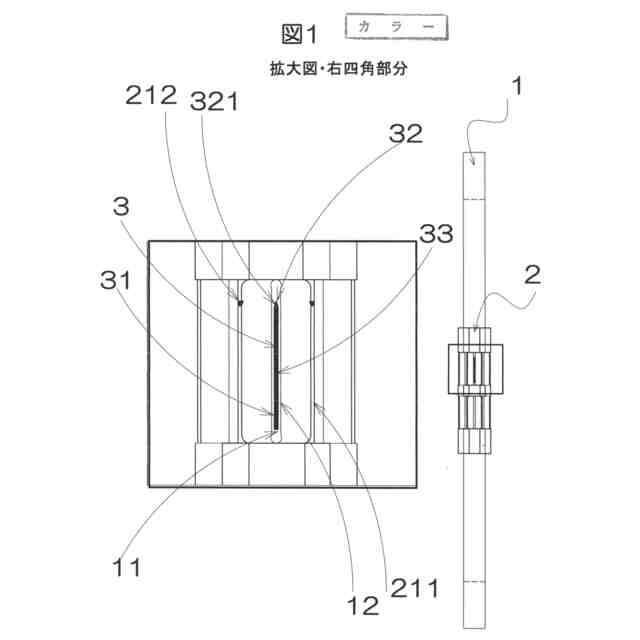 また、このレイアウトで外観可視直線35にニックが付けられないと、打ち抜かれた後、次の工程に移送される時に6mmのカス部分の間隔、通称、ドブ36が浮き上がり機械の中でジャミングして、緊急停止しなければならない。カタログ値9000ショツト/Hの打抜機でも5000-6000ショツト/Hで打ち抜いている。外観可視直線35に見えないマイクロニックが付けられると、移送で浮き上がることはないので9000ショツト/Hで打ち抜くことが可能である。マイクロニックにすると30-40%の打抜スピードが上がるのである。