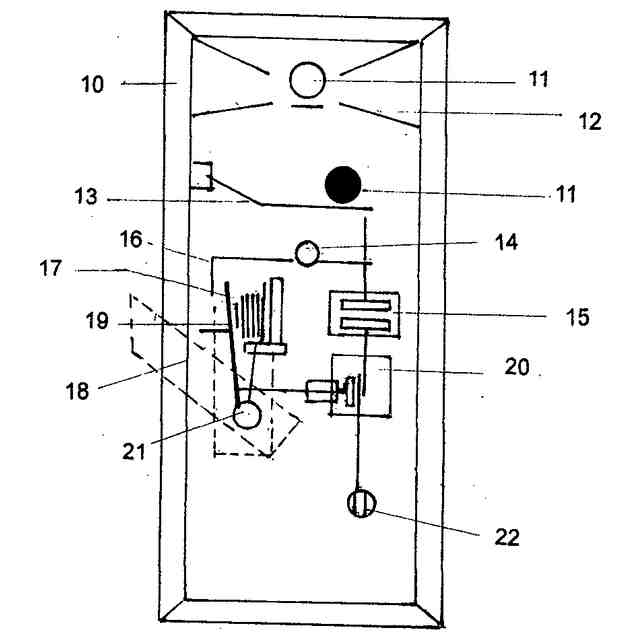 13,振動により落下球はスイッチ誘導板で2系統スイッチのテコ板に当たる