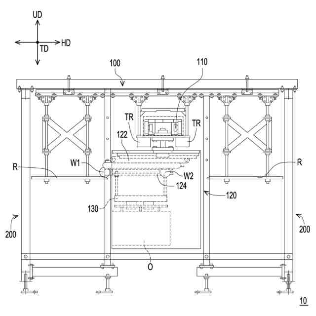 図1A及び図1Bは、本発明の物体搬送システムの異なる作動状態における説明図である。図2は、本発明の一実施形態における物体搬送装置の横方向移動機構のレールに進入する前の上面図である。図3は、図2の横方向移動機構が作動してレールに進入した後の斜視説明図である。本実施形態では、物体搬送システム10は、例えば、半導体工場内の各停留点に物体O(例えばウエハなど)を輸送し、全体の生産効率を向上させる。但し、図示しない他の実施形態では、物体搬送システム10は、物体の搬送に適した他の作業領域にも適用でき、本発明は上記の状況に限定されない。物体搬送システム10は、物体搬送装置100、及び物体搬送装置100に隣接して配置された載置台200を含む。さらに述べると、物体搬送装置100は、例えば、各停留点を結んだ走行レールTR上を走行方向TDに沿って(図1A及び図1Bの図面に垂直な方向)移動し、且つ横方向HD(図1A及び図1Bの図面の左右方向)上の2つの載置台200の間に停留する。したがって、物体搬送装置100が前記停留点に停留している時、載置台200が物体搬送装置100に隣接して配置されていることに相当する。即ち、物体搬送システム10では、物体搬送装置100が可動に設けられ、載置台200が不動に設けられる。但し、図示していない他の実施形態では、実際の必要に応じて1つの載置台200のみを設けてもよく、本発明は、これについて限定するものではない。以下では、物体搬送システム10の構造と作動方法についてさらに説明する。