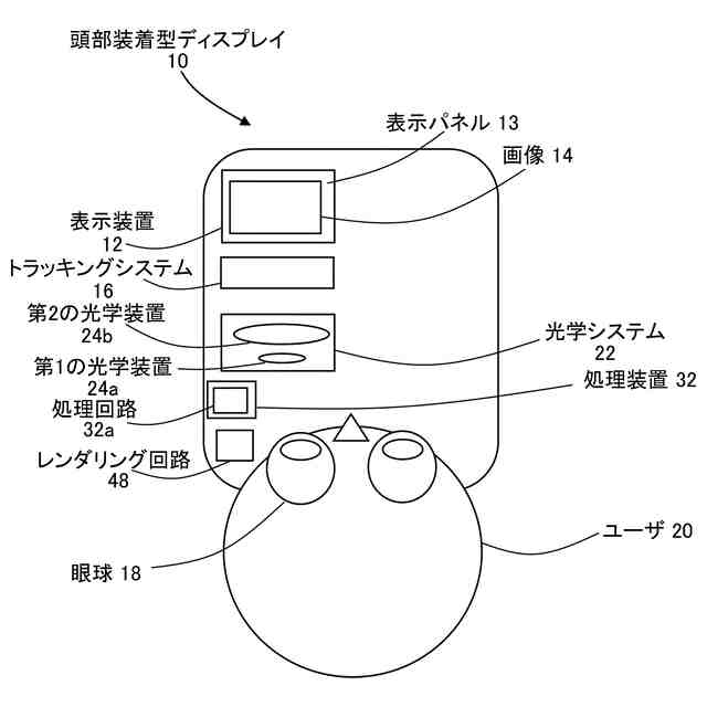 実施形態に従った頭部装着型ディスプレイ10が、図1に概略的に示される。本実施形態において、頭部装着型ディスプレイ10は表示装置12を備える。表示装置12はLCDディスプレイ、LEDディスプレイ、等を備えてよい。表示装置12は、画像14を表示する。本実施形態では、表示装置12は表示パネル13を備える。画像14は表示パネル13上に表示される。画像14は、2次元または3次元シーンの画像であってよい。