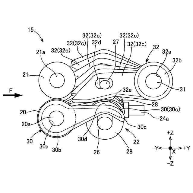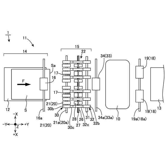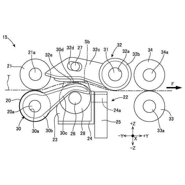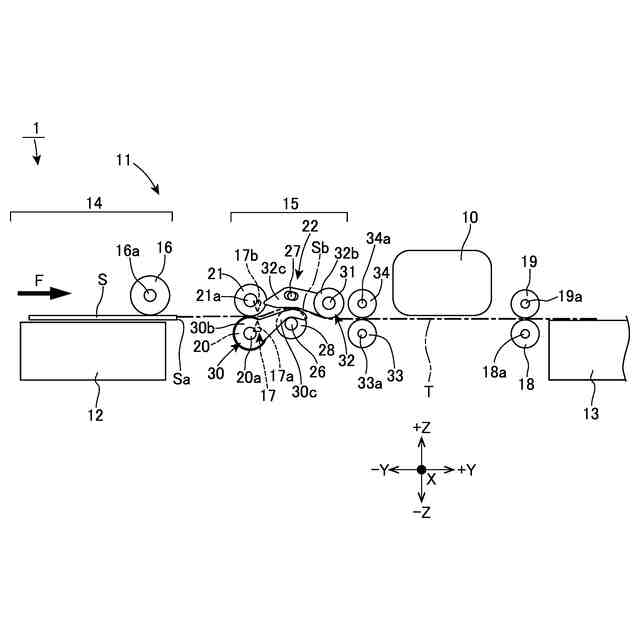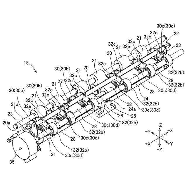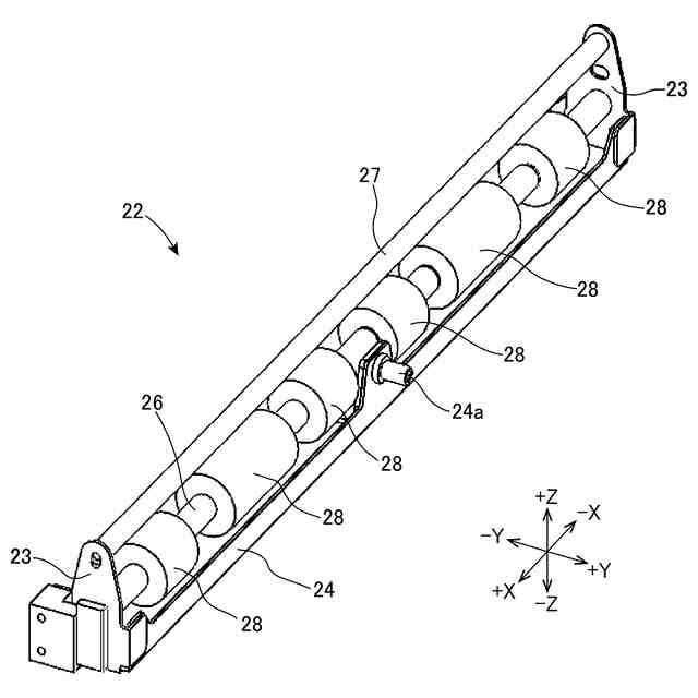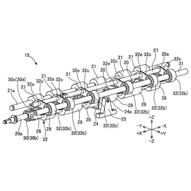 前記斜行修正手段は、前記シートの搬送方向と直交する方向であって前記シートの搬送経路を挟んで一方の側と他方の側に配置され、それぞれが前記シートの幅方向に延びる第1支持軸と第2支持軸とを備え、前記シートの斜行量に応じて、前記第1支持軸と前記第2支持軸を搬送方向と平行な軸線の周りに一体に回動させ、