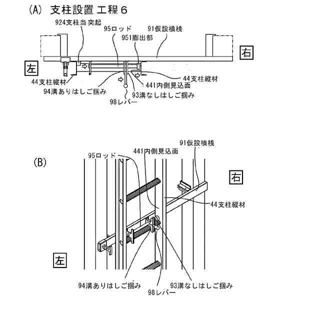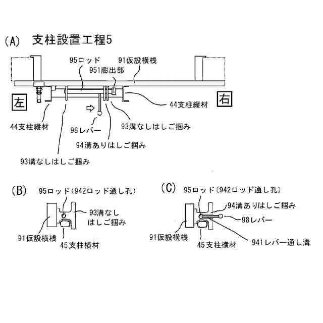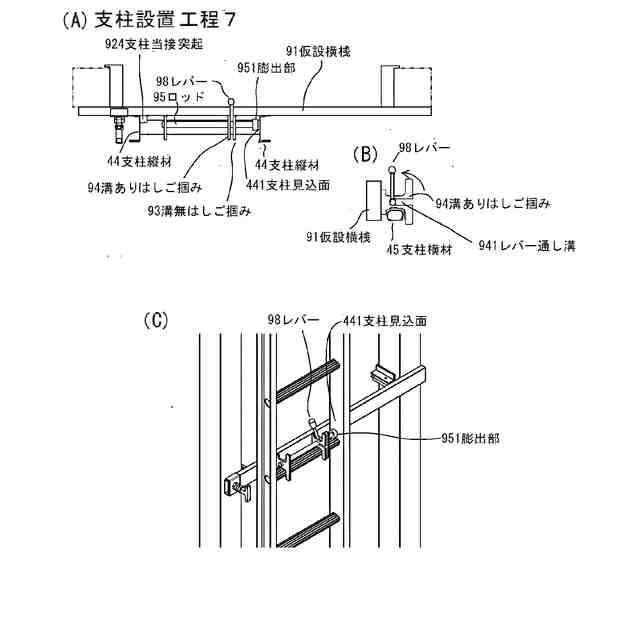 図7は(支柱設置工程5)の説明図である。図7(A)は(支柱設置工程5)の説明図である。図7(B)は溝なしはしご掴みとロッドの関係の説明図である。図7(C)は溝ありはしご掴みとレバーとの関係を示す説明図である。