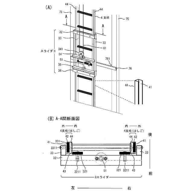 図2は実施例1のスライダと支柱の説明図である。図2(A)は、荷台等を外し、支柱とスライダの取り付け関係を説明する図である。図2(B)は、図2(A)のA-A間の断面図である。