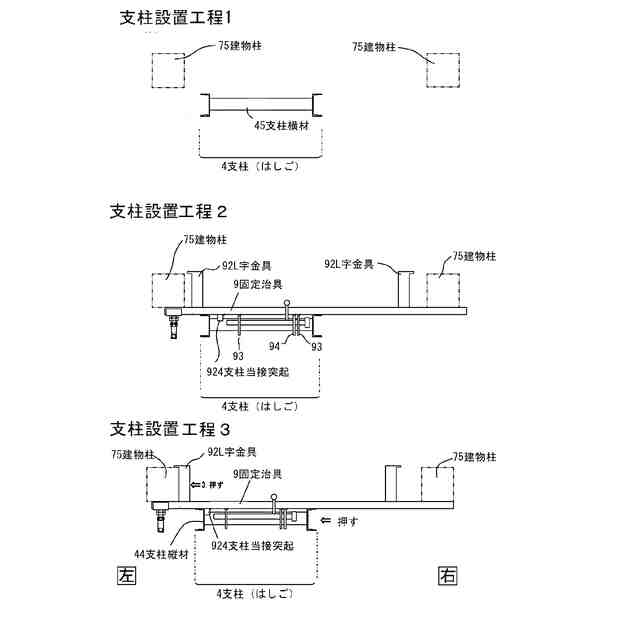 図3は、支柱(はしご)を固定する(支柱設置工程1)~(支柱設置工程3)の説明図である。